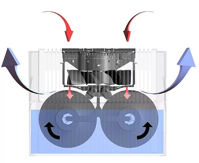 Работает такая технология, как говорится, просто и гениально. Внутри установлены пластиковые барабаны, которые постоянно вращаются в поддоне с водой. Мощный бесшумный вентилятор засасывает внутрь комнатный воздух, который контактирует с большой площадью вращающихся пластин.