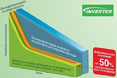 Инверторное же управление системой кондиционирования предполагает плавное изменение параметров работы - инверторная сплит-система работает не по принципу "включения\выключения" - в процессе работы она плавно увеличивает или уменьшает свою производительность в зависимости от разности заданных и текущих температур. Нужно быстро охладить помещение - инверторный кондиционер выходит на максимальную производительность; температура уже близка к заданным значениям - система переходит в минимальный экономичный режим работы.
