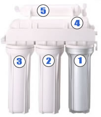 а) 5-и ступенчатый обратноосмотический фильтр (система обратного осмоса): 1-я ступень - предварительная очистка от механических примесей ~ 15-30 мкм (микрон); 2-я ступень - очистка активированным углем от хлора и хлорорганических соединений; 3-я ступень - тонкая очистка от механических примесей ~ 1-5 мкм (микрон) или доочистка прессованным активированным углем (данная дополнительная ступень в 5 ступенчатом фильтре позволяет лучше защитить мембрану - которая в свою очередь прослужит дольше); 4-я ступень - очистка мембраной (метод обратного осмоса); 5-я ступень - угольный постфильтр.