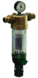 сетки фильтра отфильтрованной водой. Таким образом, верхний фильтр также очищается струей воды от крыльчатки. Когда шаровый кран снова закроется, фильтр автоматически возвратится в рабочее положение. К такому фильтру можно подключить автомат промыва, который в заданный момент (устанавливается пользователем) активизирует процесс промыва фильтра. Фильтры для горячей воды выполнены в полностью латунном корпусе