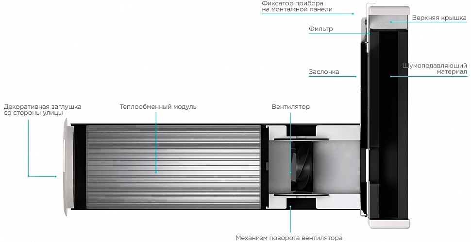Через единый воздуховод организуется последовательная подача через теплообменник свежего очищенного воздуха с улицы и отток насыщенного СО2 воздуха из помещения. При этом теплый "отработанный" воздух из комнаты проходя через теплообменник отдает ему свое тепло, за счет которого приточный воздушный поток прогревается.